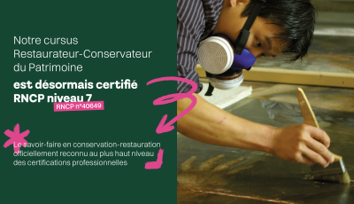 Disponible à Lyon et à Paris notre objectif est de former de jeunes professionnels investis d’une mission de préservation, de conservation et de valorisation du patrimoine.